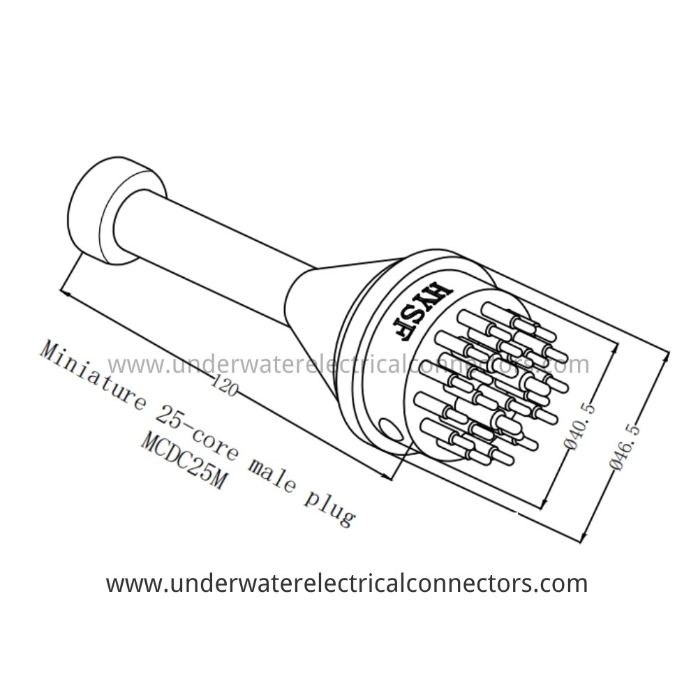The HYSF MCDC25M is a protective 25-pin male dummy connector used to seal and safeguard unused male ports from contamination and corrosion in harsh marine environments. Made from durable neoprene with secure locking mechanism, it maintains full pressure resistance up to 6000 meters (60 MPa). Essential accessory for preserving maximum-density connector integrity in ROV, AUV, and subsea equipment during storage or deployment.