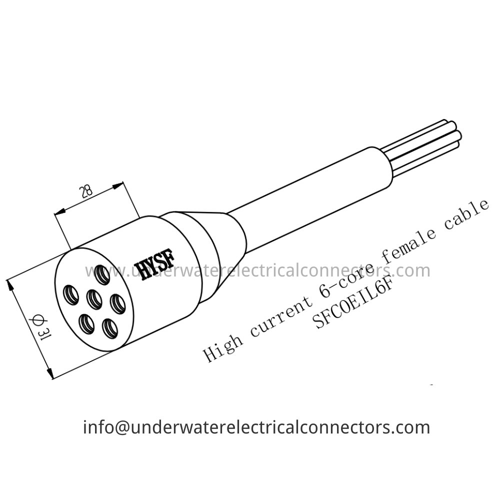 The HYSF SFCOEIL6F is a durable high current 6-core female inline watertight connector with 5/8 thread, designed for secure high-density multi-channel cable-to-cable links in harsh subsea environments. Perfect for offshore high-current multi-phase systems, ROV power feeds, underwater equipment, and marine high-amperage applications with six channels. Precision-engineered with premium construction and advanced sealing, it withstands extreme pressures and corrosion at full ocean depths. HYSF offers proven high current 6-core 5/8 thread female inline underwater connectors for offshore high-power projects from China.