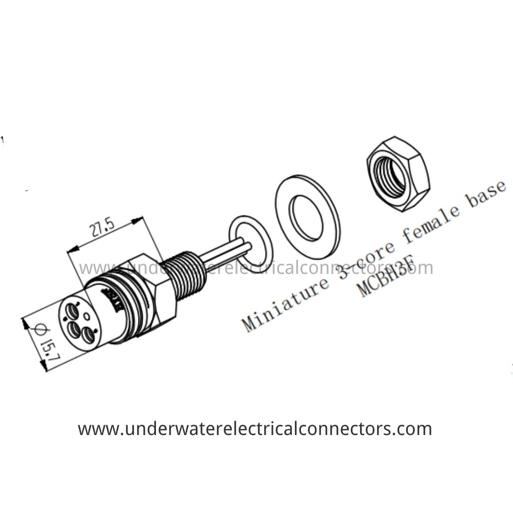 The HYSF MCBH3F is a high-reliability 3-pin female bulkhead watertight connector optimised for secure panel mounting in deep-sea equipment. Commonly applied in underwater sensors, ROV thrusters, subsea monitoring systems, and ocean research tools needing dependable sealed interfaces. Made with marine-grade materials, gold-plated copper alloy contacts, and strong neoprene molding, it offers IP68 waterproofing and 60 MPa pressure resistance (6000 m depth). High corrosion resistance and repeated mating capability ensure long service life in challenging subsea and offshore environments.