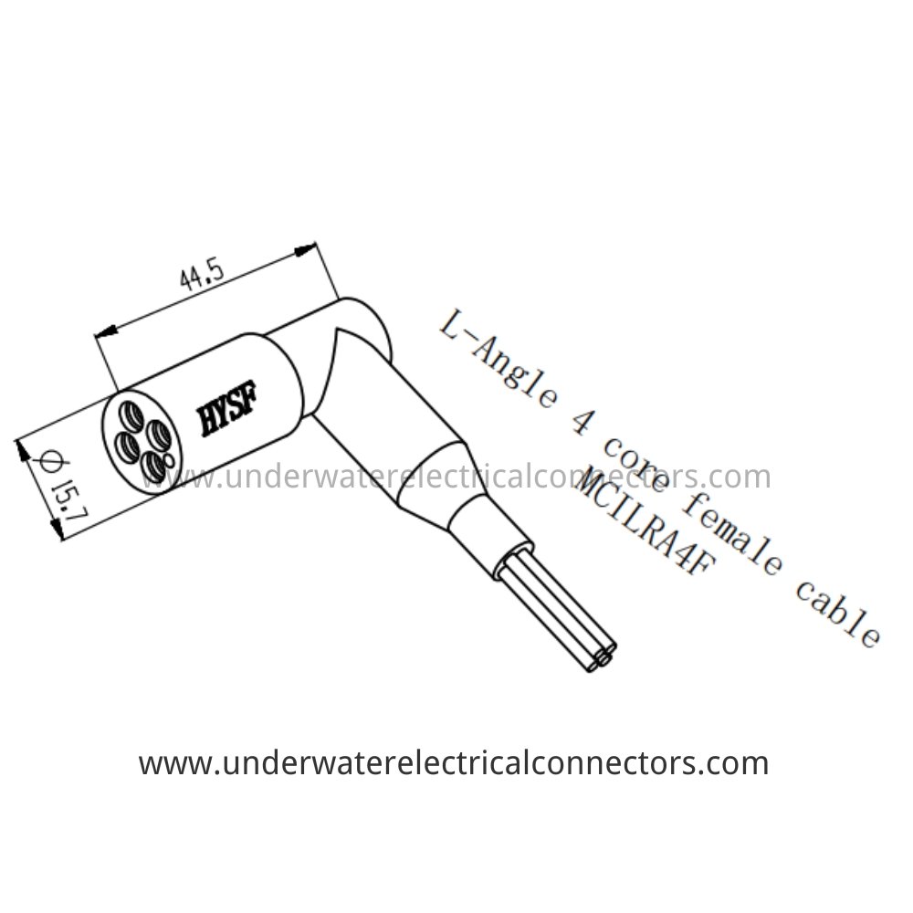The HYSF MCILRA4F is a compact L-angle 4-core female inline watertight connector optimised for confined-space subsea applications with right-angle cable routing and robust multi-channel performance. Excellent for ROV thrusters, AUV control lines, underwater lighting systems, and marine instrumentation. Engineered with premium materials, gold-plated contacts, and neoprene body, it maintains IP68 integrity at 6000-meter depths (60 MPa). High corrosion resistance and low maintenance make it ideal for deep-water 90-degree underwater connectors.