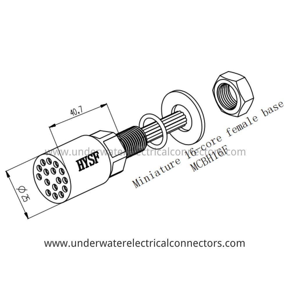 The HYSF MCBH16F is a high-performance 16-pin female bulkhead watertight connector engineered for reliable panel mounting in deep-water ultra-high-density systems. Commonly applied in extensive underwater sensor networks, ROV multi-tool controls, subsea high-bandwidth telemetry, and marine research platforms requiring robust sealed interfaces. Made with marine-grade materials, gold-plated copper alloy contacts, and strong neoprene molding, it offers IP68 protection and resists 60 MPa pressure (6000 m depth). Excellent corrosion resistance and repeated mating capability ensure long service life in challenging subsea environments.