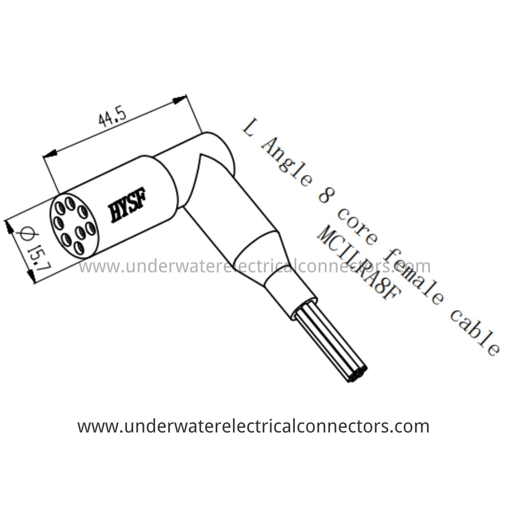 The HYSF MCILRA8F is a compact L-angle 8-core female inline watertight connector optimised for space-constrained subsea systems requiring right-angle routing and high-density multi-channel transmission. Perfect for large ROVs, AUV data hubs, underwater multi-feed sensors, and marine scientific instruments. Precision-crafted with premium marine-grade materials, gold-plated contacts, and robust neoprene, it maintains IP68 integrity at 6000-meter depths (60 MPa). Excellent corrosion protection and reliability make it the standard for deep-water 90-degree high-pin connectors.